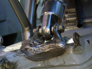 ↑ ショックアブソーバはキタコの車高調付きです。 ブラケットはコレでもかっ!と、いうほど溶接ビードを重ねたので外観はキタナイけど、もげることはまず無いでしょう。