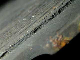 ← フロントのパッドは残り1mm以下になっていたので要交換。 サービスマニュアルではパッド厚1mmが交換目安となっているのでかなり危険な状況。(^^; |