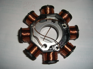 ![]() ワイヤーの巻き方は左図の通りです。 ひとつの極を巻ききったら隣の極に移動して反対巻きで巻いていきます。 この図は概要的に表現したものです。 実際にはワイヤーが鉄芯の内側に来たときに隣の極に移るようにします。 要は1極ごとに右巻き左巻きを繰り返していけば良いわけです。 しっかりテンションをかけながら、ワイヤーの被覆を傷付けないように丁寧に巻いていきます。 |