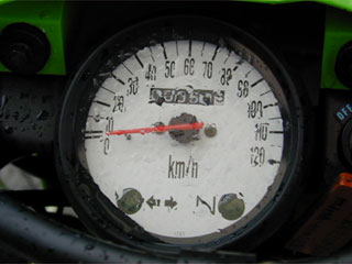 スピードメータ 白色のパネルを採用したことにより、視認性を高めています、最近自動車にもおおいですよね。 ニュートラルとターンインジケータしか警告灯がありませんので非常にシンプルです、120Km/hスケールの文字盤は一見速そうなバイクに見えます。 トリップメータは残念ながら追加されませんでした。 |