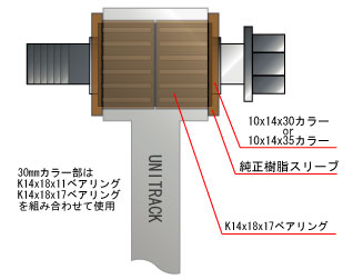 リチウムグリスをたっぷり塗りつけユニトラックを組み上げます。 写真は見やすいようにカラーとベアリングをわざとずらしてます。 |
